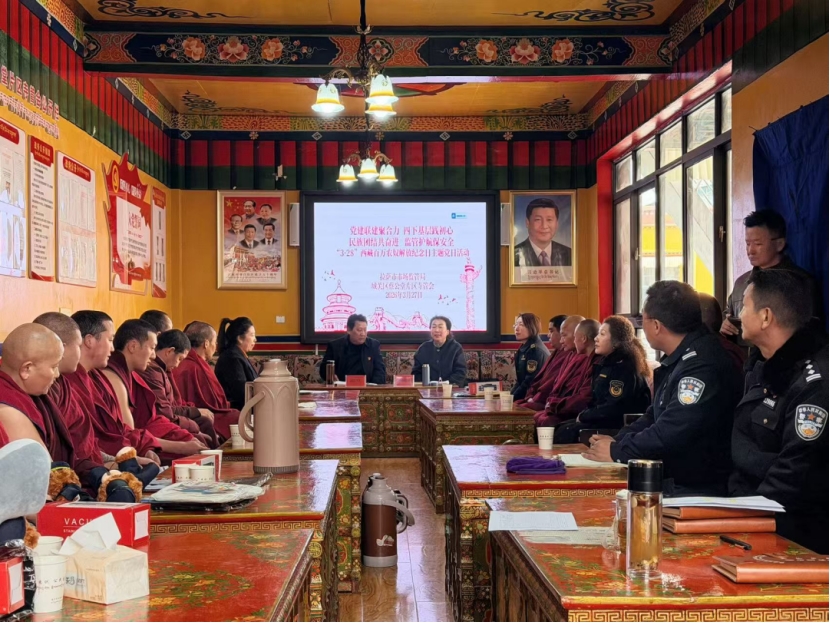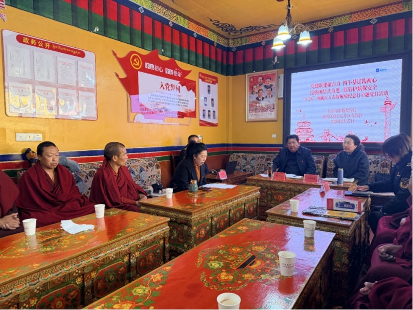 为深入践行市委“四下基层”工作要求,不断推进“国家意识、公民意识、法治意识”宣传教育,3月27日上午,拉萨市市场监管局、城关区蔡公堂片区寺管会纪念3·28西藏百万农奴解放纪念日联合主题党日活动,在公堂寺举行。活动现场气氛热烈,近60名僧尼、寺管会工作人员、市场监管局党员干部齐聚一堂,一听党的民族政策和新时代党的治藏方略,二讲西藏民主改革伟大成就,三学食品药品等市场监管领域安全知识。宣讲团用僧尼喜闻乐见的方式,引导大家自觉铸牢中华民族共同体意识,坚定爱国爱教、团结进步的思想理念,自觉维护国家统一、民族团结和宗教和睦。市市场监管局党组书记、副局长、包保蔡公堂街道领导格西斯满,蔡公堂片区寺管会党组书记、主任边巴次仁,市市场监管局机关党委、机关第一、二、三党支部有关同志,蔡公堂片区寺管会工作人员参加活动。