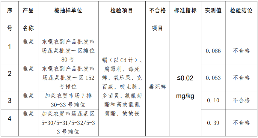 计划全年,抽样检验食品及食用农产品2200批次,截止7月4日,已抽样882批次,已检测完成544批次,不合格4批次,合格率为99.3%。抽检辖区覆盖了城关区、堆龙德庆区、墨竹工卡县、曲水县等6个县(区)。重点抽样乳制品、饮料、矿泉水、粽子、水果、蔬菜等23个食品大类,涉及80多个品种。主要检测项目有重金属、真菌毒素、微生物、农药残留、兽药残留和质量指标等。经拉萨中检综合产品检验检测有限公司检验4批次韭菜“毒死蜱”项目不符合GB2763-2021《食品安全国家标准 食品中农药最大残留限量》要求,检验结论为不合格。被抽样单位为堆龙德庆区东嘎农副产品批发市场蔬菜批发区2个摊位和拉萨市加荣农贸市场2个摊位,不合格检验报告已移交属地市场监管部门,要求及时核查处置。